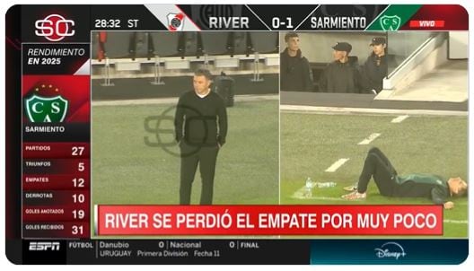 Esto se vio acrecentado sobre el final cuando Sarmiento sufrió el empate de River Plate por obra de Miguel Borja. Ya se jugaban los cinco minutos de adición cuando el colombiano empujó al gol y decretaba el empate. Esta situación llevó al ex delantero de Racing a reaccionar con bronca y patear una pelota. Sin embargo, la acción fue invalidada por el VAR, ya que el Colibrí picó en posición adelantada cuando Cristian Jaime lo asistió tras una excelente jugada individual.