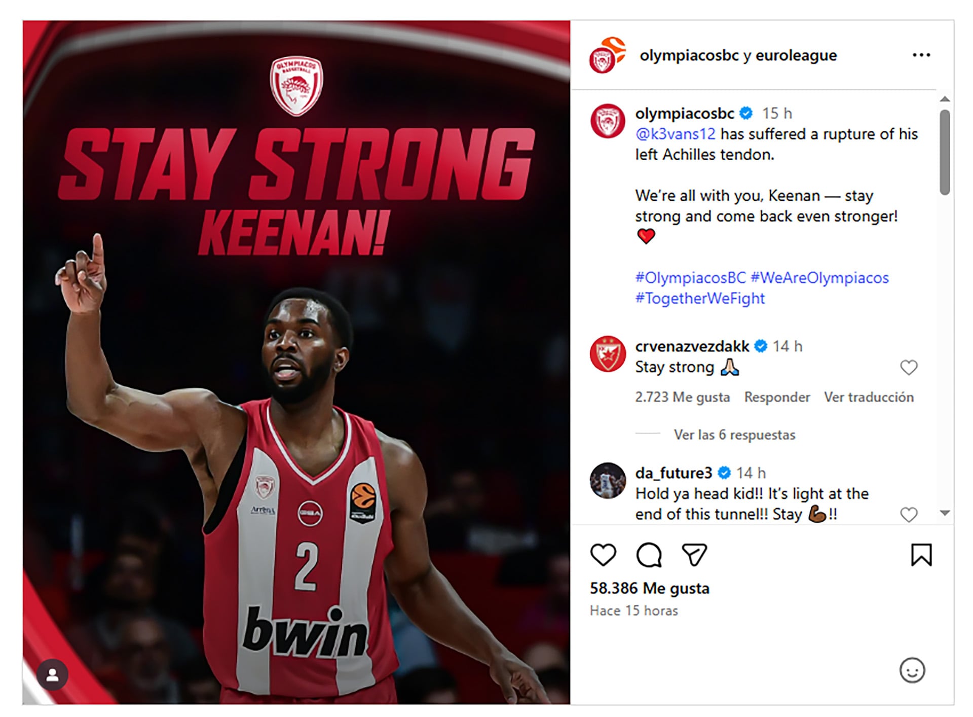 El infortunio de Evans llegó en un contexto de alta expectación. El jugador había reaparecido con el Olympiacos recientemente en un partido de la liga griega contra el Karditsa, donde logró quince puntos, cinco asistencias y veintiún de valoración. Su retorno resultó significativo para la afición, que lo recibió con pancartas y aplausos. “¡Estamos contigo, Keenan! ¡Mantente fuerte y vuelve aún más fuerte!”, fue el mensaje que compartió el club en sus redes sociales.