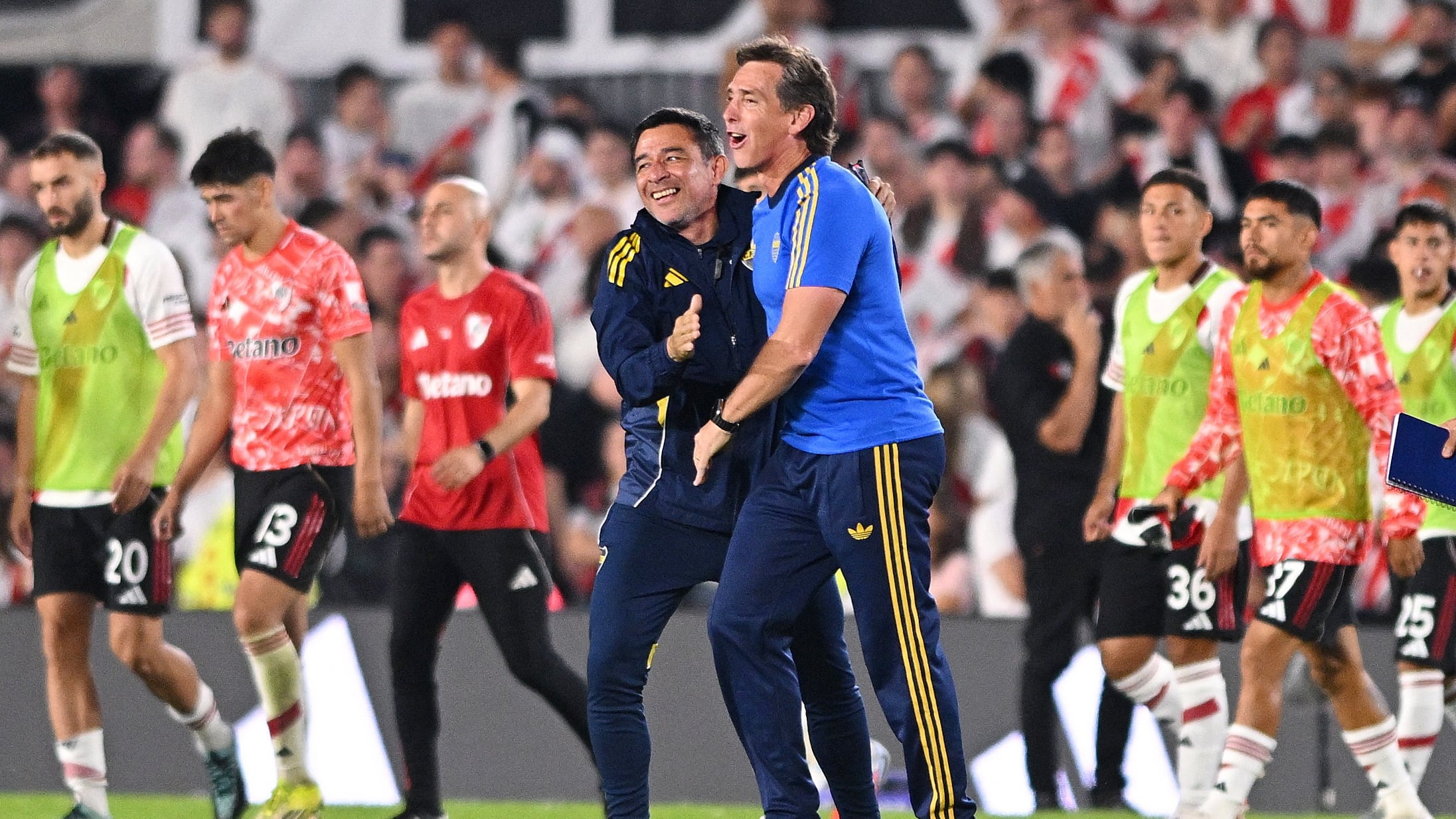 Después del match en el Monumental, a Riquelme se lo vio muy risueño paseando por el anillo del estadio camino al vehículo que trasladó a la delegación visitante. Durante su caminata, se cruzó a Rodríguez y le exclamó: “Juvenal, Juvenal, vamos”. Si bien no paró a dialogar con la prensa, el presidente boquense sacó chapa al pasar con una frase: “Ganamos dos superclásicos en seis meses”.