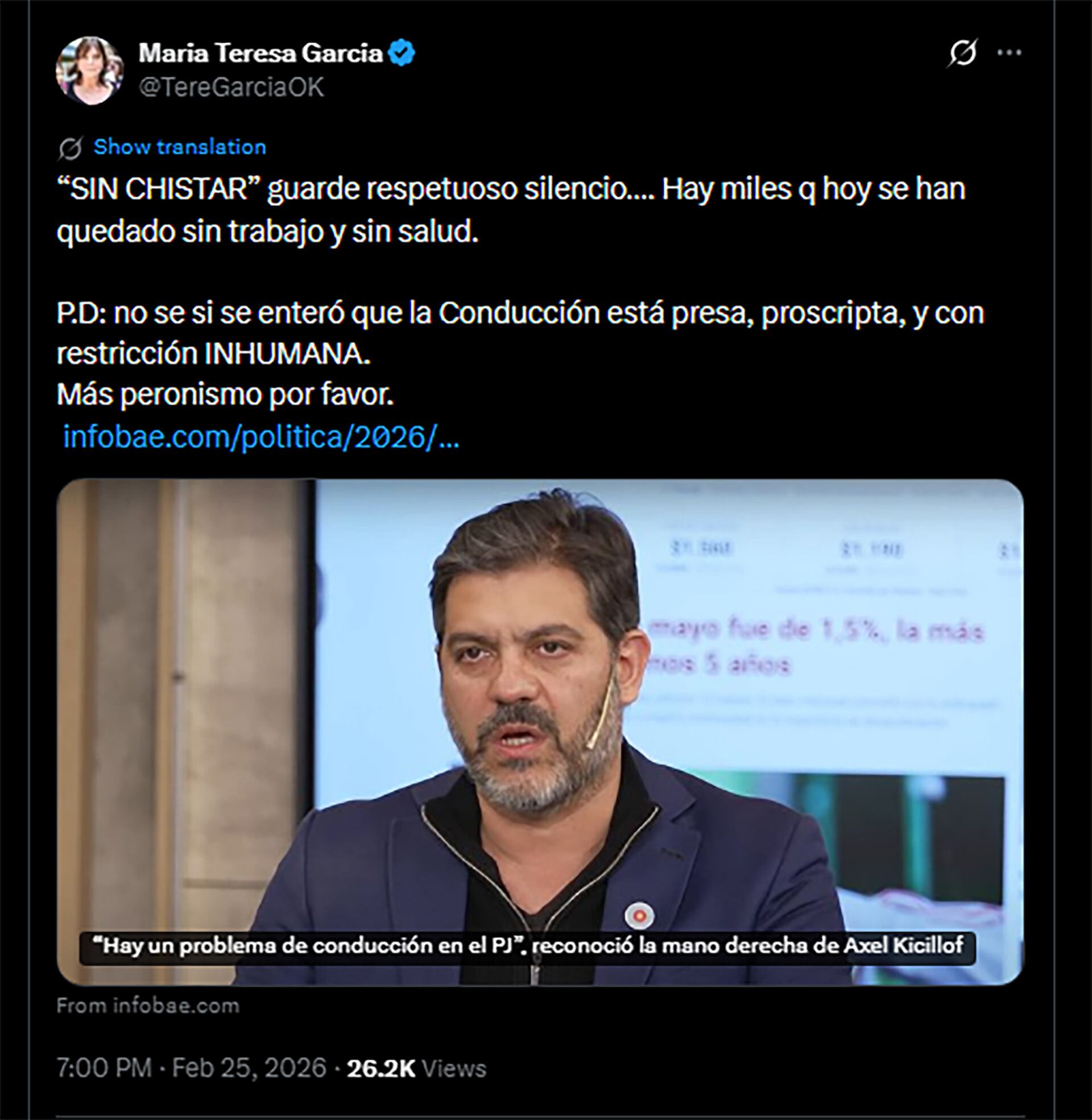 Quien salió al cruce fue María Teresa García, diputada nacional y secretaria general del Partido Justicialista. “Más peronismo, por favor”, escribió la dirigente en su cuenta de X, donde además compartió un artículo de este medio con los dichos de Bianco.