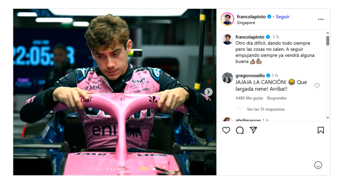 Luego de la competencia, el piloto bonaerense, de 22 años, compartió en su cuenta de Instagram un mensaje dirigido a sus seguidores en el que expresó: “Otro día difícil, dando todo siempre, pero las cosas no salen. A seguir empujando siempre, ya vendrá alguna buena”.