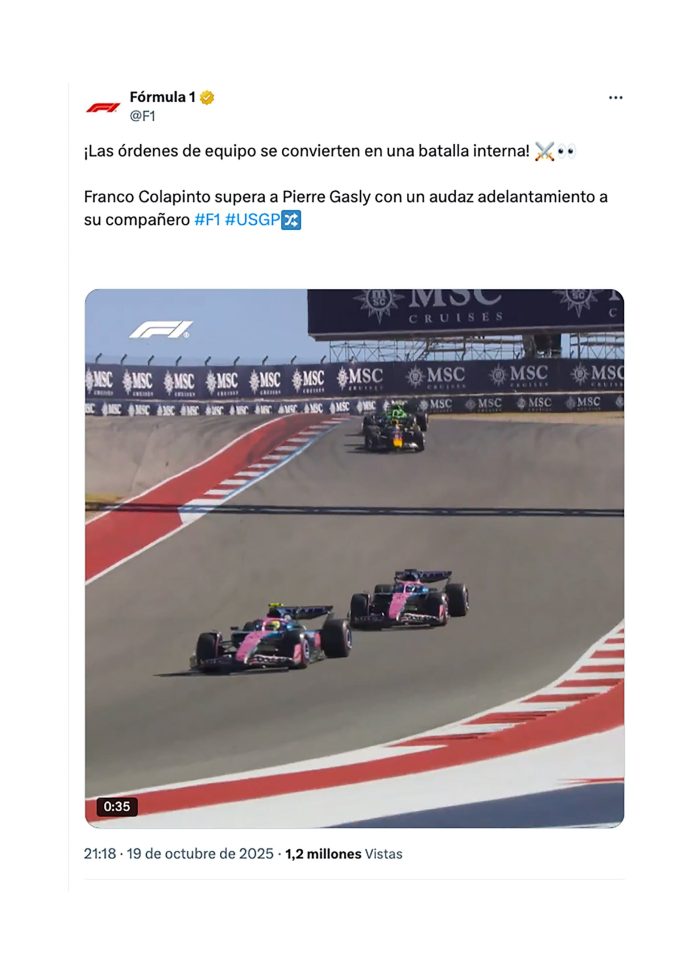 Las cuentas oficiales de las redes sociales de la Fórmula 1 hicieron principal hincapié en la precisa maniobra de adelantamiento del argentino, al mismo tiempo que puntualizaron en la actitud del joven de 22 años. “¡Las órdenes de equipo se convierten en una batalla interna del equipo! Franco Colapinto supera a Pierre Gasly con un audaz adelantamiento a su compañero de equipo”, indicaron en X (antes Twitter). “Eso no se ve como si estuviera escuchando la orden. Colapinto omite la radio y pasa”, comentó el relator británico.