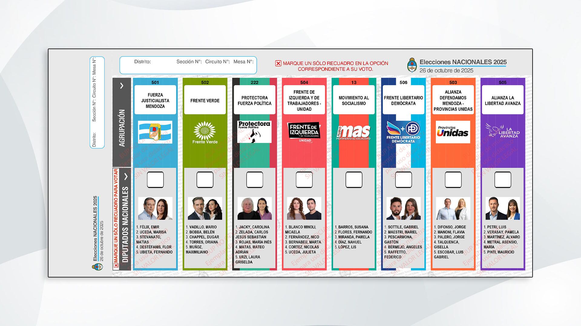 La Boleta Única de Papel de Mendoza para los comicios legislativos muestra a los principales candidatos de las 8 listas que se presentan.