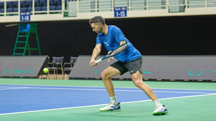 Guido Andreozzi, durante uno de los entrenamientos de la Selección Argentina de Tenis en Busan (Crédito: Prensa AAT)