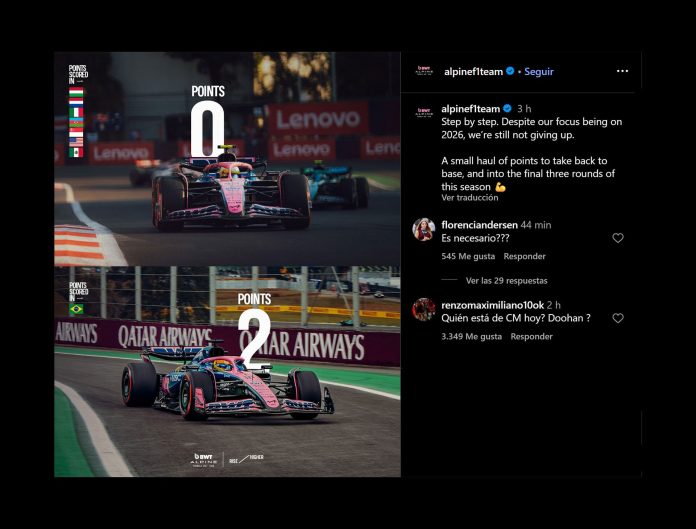 La controversia surgió cuando, tras la carrera, las cuentas oficiales de Alpine en X e Instagram publicaron: “Paso a paso. Aunque nuestro objetivo es 2026, no nos rendimos”. Luego agregaron “un pequeño botín de puntos para llevar de vuelta a la base, y para las tres últimas rondas de esta temporada”.