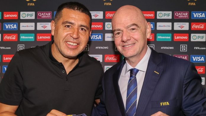 Gianni Infantino con el presidente de Boca Juniors, Juan Román Riquelme, durante el Mundial de Clubes