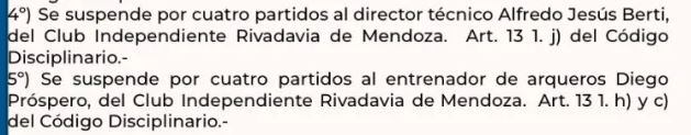 El fallo disciplinario no solo alcanzó al director técnico. El entrenador de arqueros, Diego Próspero, recibió también una suspensión de cuatro partidos, fundamentada en los incisos h) y c) del mismo artículo, que contemplan sanciones por desaprobación con palabras o acciones y por conducta violenta, según detallaron Mendoza Post y Los Andes. Además, los jugadores Franco Maximiliano Amarfil y Alejo Osella fueron sancionados con un partido de suspensión cada uno por doble amonestación, mientras que Matías Alejandro Fernández recibió una suspensión de cuatro fechas tras ser expulsado por protestar desde el banco de suplentes.