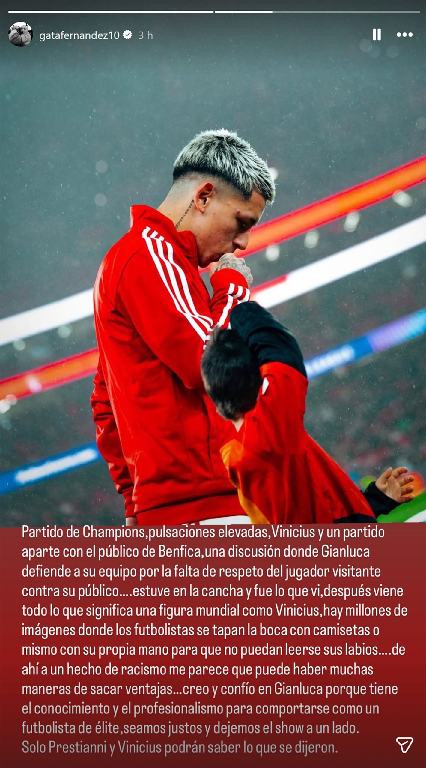 El representante de Gianluca Prestianni, Gastón Fernández, profundizó el debate sobre los supuestos dichos discriminatorios del futbolista del Benfica hacia el brasileño Vinicius Jr. en el marco del duelo válido por los playoffs de la Champions League en el estadio da Luz. En sus redes sociales, el agente de 42 años compartió su visión de los hechos, afirmando que presenció el intercambio de palabras en el lugar de los hechos: “Partido de Champions, pulsaciones elevadas, Vinicius y un partido aparte con el público de Benfica. Una discusión donde Gianluca defiende a su equipo por la falta de respeto del jugador visitante contra su público… Estuve en la cancha y fue lo que vi”.