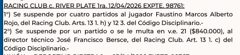 El fallo del Tribunal de Disciplina se basó tanto en la conducta violenta como en la reincidencia en insultos agravados. El árbitro Zunino ya había amonestado a Rojo en el entretiempo por protestar, lo que incrementó la tensión en un partido cargado de reclamos. La sanción abarca los próximos tres compromisos de Racing ante Aldosivi, Barracas Central y Huracán por la fase regular, además de un eventual cruce de octavos de final.