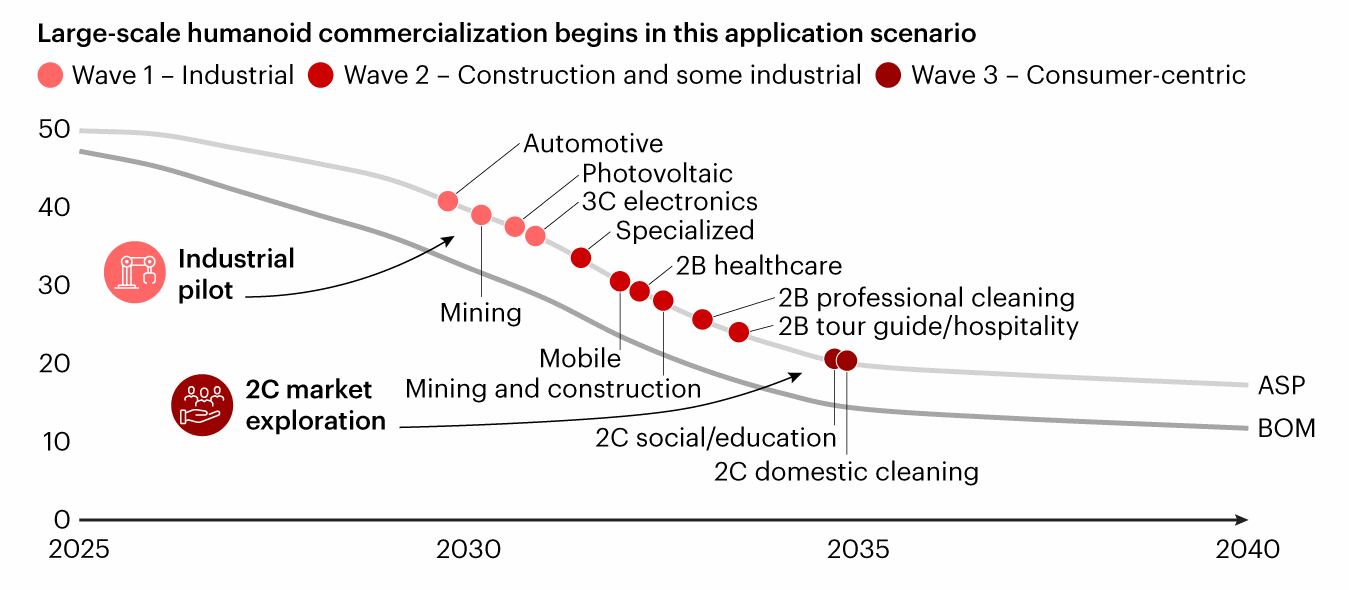 Según Bain & Company, la madurez del sector depende de dos pilares: la demostración de un retorno de inversión (ROI) y una mayor tolerancia al riesgo por parte de los usuarios. Además, consideran que este proceso se dará en distintas etapas: una primera ola será de pilotos de activación concentrada en entornos industriales como automotriz, minería, energía fotovoltaica y electrónica especializada, donde el retorno sobre la inversión es más claro y viable. En una segunda etapa, la aplicación se expandirá hacia sectores de la construcción, cuidado de la salud y algunos servicios industriales. El tramo final será la consolidación en aplicaciones comerciales y de consumo, como limpieza profesional y doméstica, hospitalidad, educación y turismo.