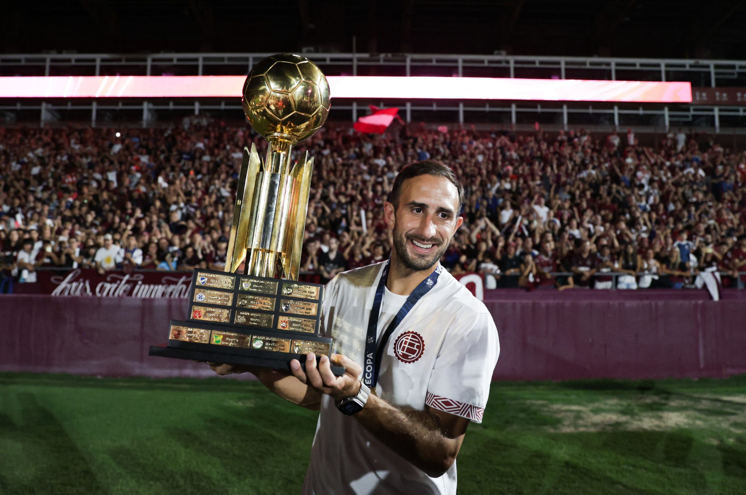 Carlos Izquierdoz, capitán y referente del equipo, con la Recopa Sudamericana que obtuvo Lanús (AFP)