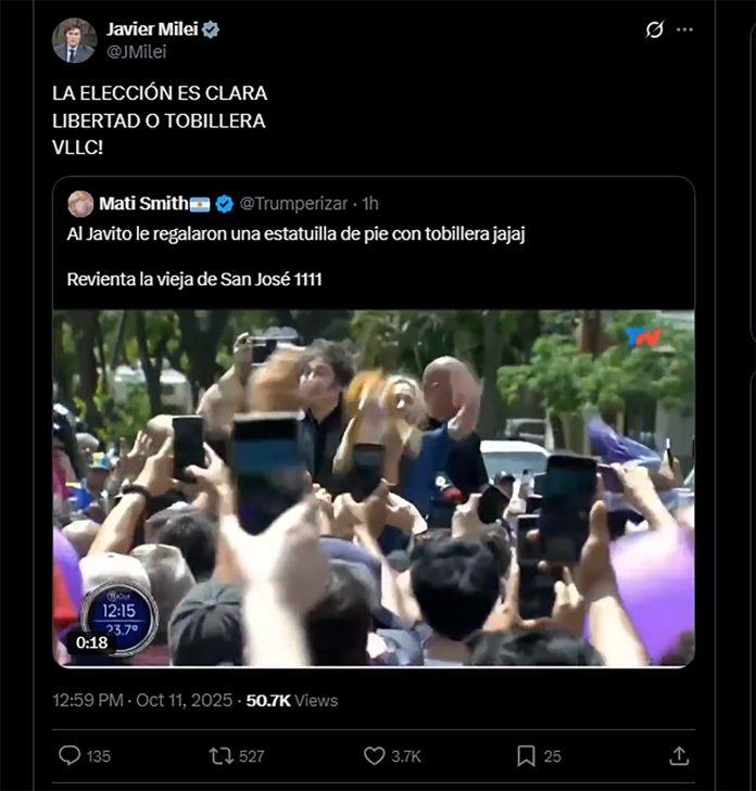 El presidente de la Nación, Javier Gerardo Milei, posteó durante su visita de campaña a Chaco, una chicana contra la expresidenta Cristina Kirchner, actualmente detenida con prisión domiciliaria: LA ELECCIÓN ES CLARA LIBERTAD O TOBILLERA VLLC!“.