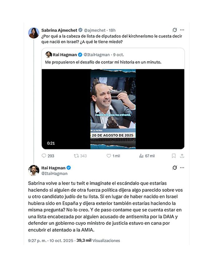 “¿Por qué a la cabeza de lista de diputados del kirchnerismo le cuesta decir que nació en Israel?”. La diputada nacional y candidata a renovar su banca por La Libertad Avanza Sabrina Ajmechet abrió con esa pregunta -posteada en la red social X- una polémica con su “rival” Itai Hagman.