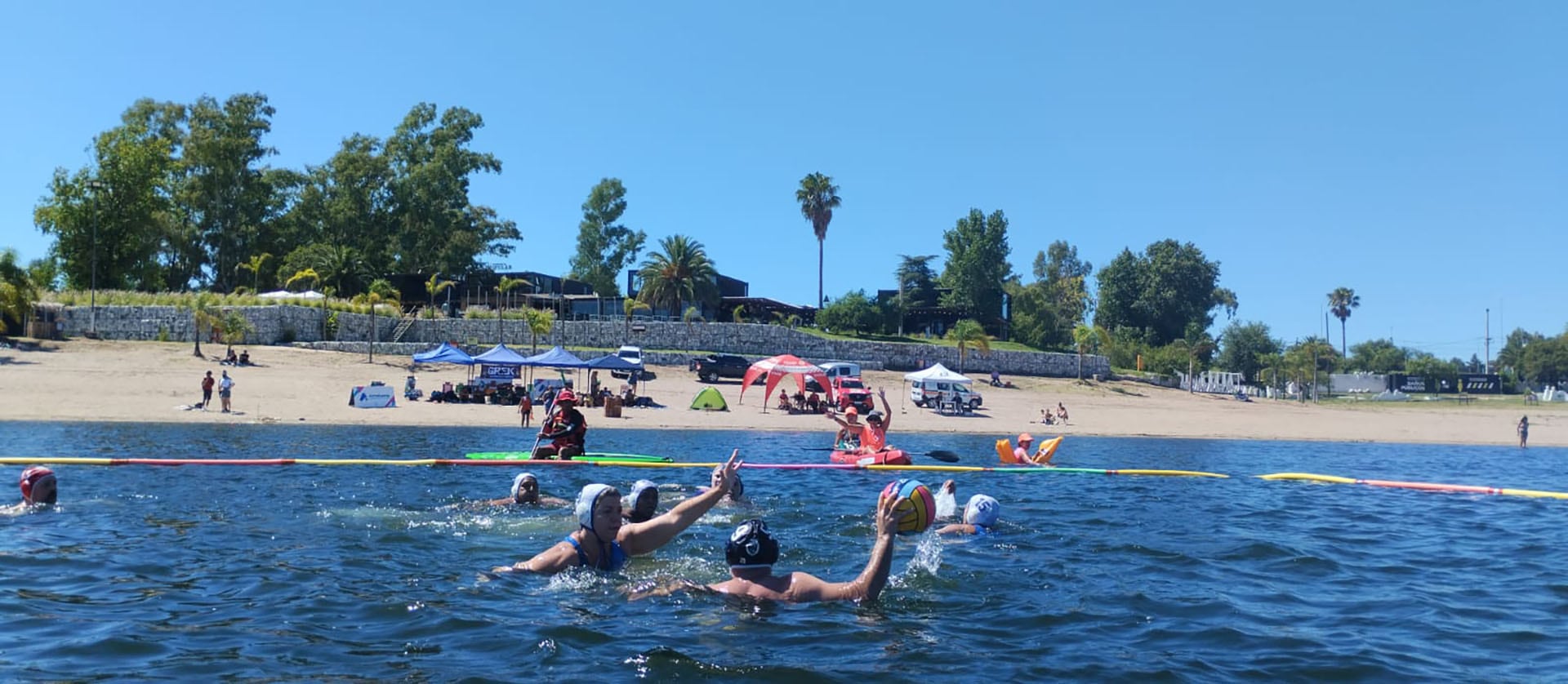 En el agua no hay andariveles ni líneas negras en el fondo. No hay fondo, de hecho. Se flota todo el tiempo. Se nada, se tracciona, se gira con el viento en contra. Y en ese escenario abierto, con algas que rozan las piernas y el sol que encandila, un grupo de jugadores mayores de 50 años vuelve a competir.