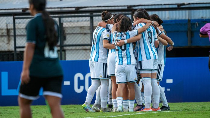 Las jugadoras de la selección argentina femenina Sub-17 celebran un gol durante su contundente victoria ante Bolivia en el Sudamericano Femenino. El equipo está invicto (@Argentina)