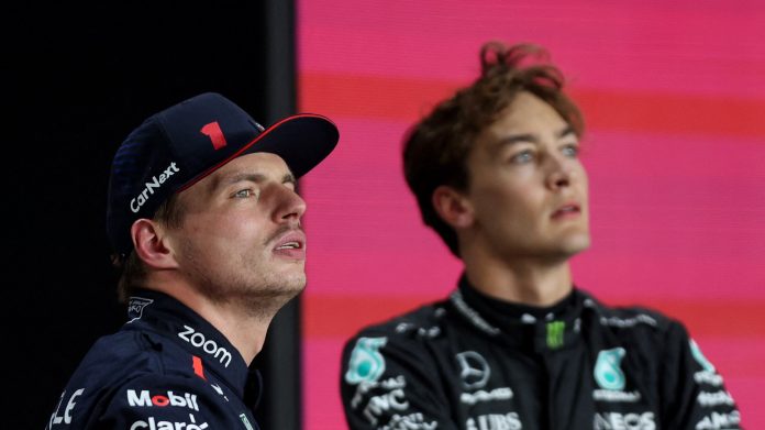 El tiempo ayudó a calmar los ánimos y este año Max Verstappen y George Russell celebraron cuando compartieron podios (REUTERS/Leonhard Foeger)