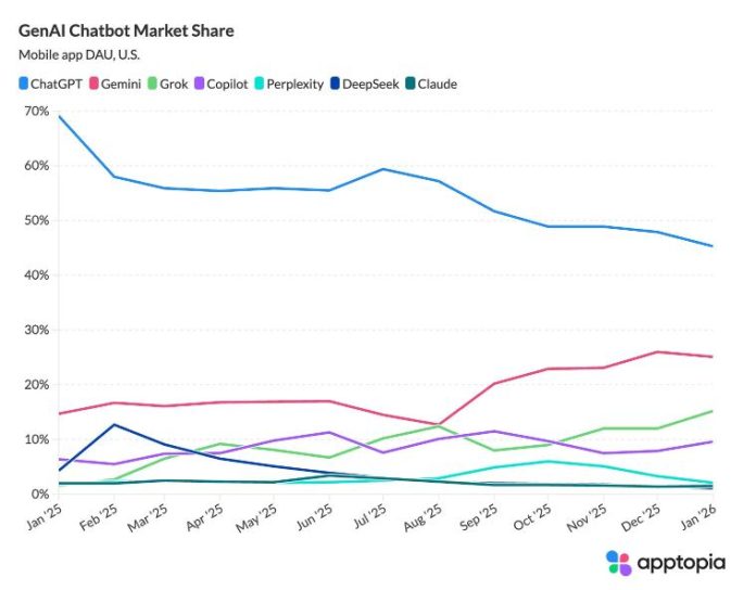 Según publicó el periodista Alex Kantrowitz, en el sitio Big Technology, la participación de mercado de ChatGPT entre los usuarios diarios de IA en EE.UU. cayó, en enero de 2026, del 69,1% al 45,3%, en relación a un año atrás.