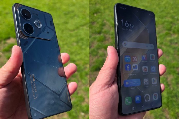 El Tecno Pova 6 apuesta por un panel AMOLED de 6,78 pulgadas con resolución Full HD+ y tasa de refresco de 120 Hz. En números, la promesa es de hasta 1300 nits de brillo máximo, lo que se traduce en buena visibilidad incluso bajo el sol (como se ve en la fotografía que acompaña la nota).